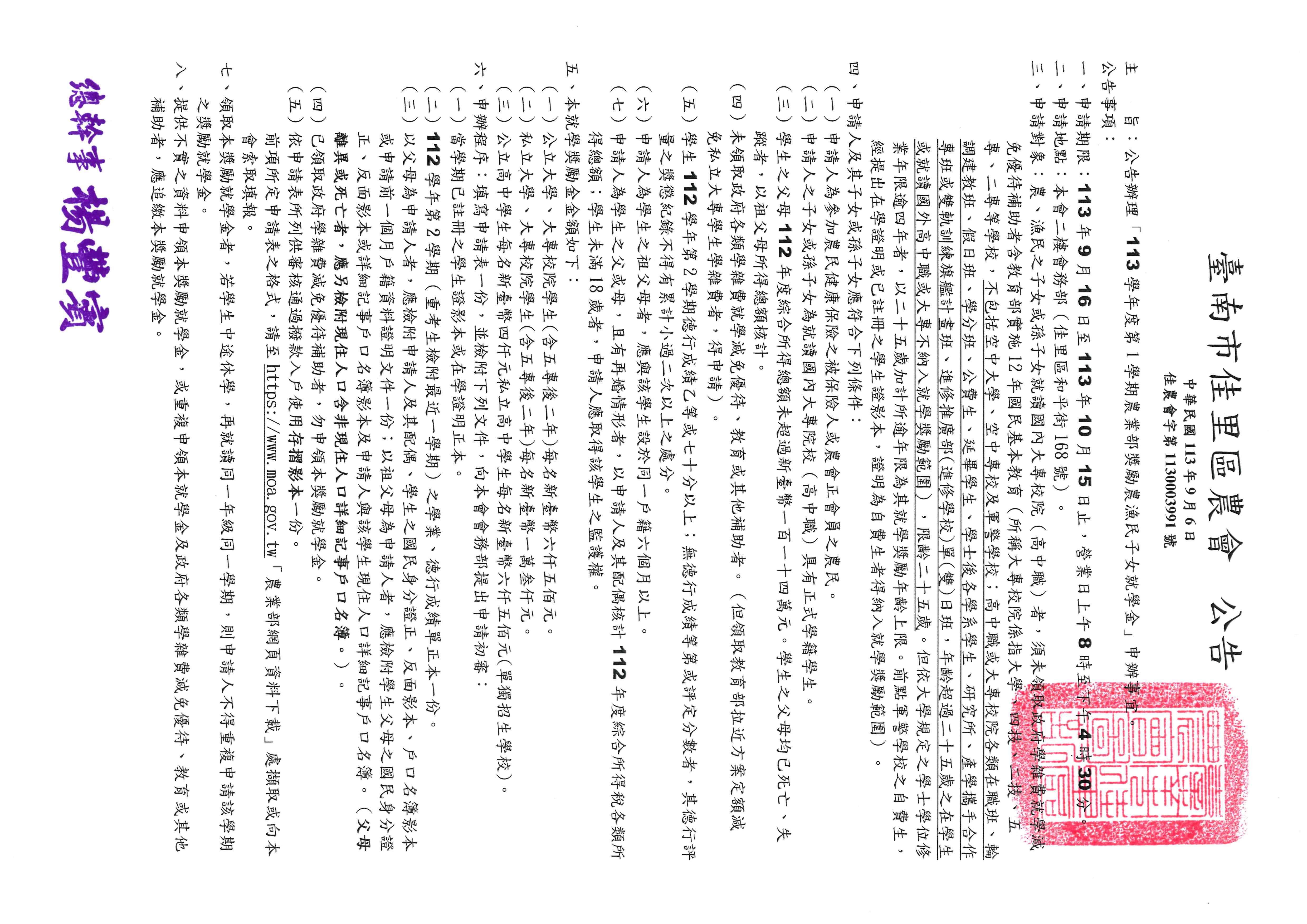 113學年度第一學期農業部獎勵農漁民子女就學金
